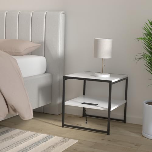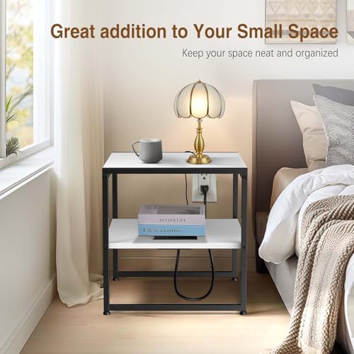 Tatub 20″ End Table with Charging Station, Industrial Square Side Table with USB Ports & Outlets, Versatile 2-Tier Small Nightstand for Bedroom Living Room, White