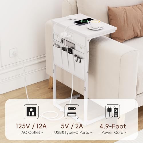 Vagusicc C Shaped End Table with Charging Station, 28″ Tall Side Table for Couch, Small Slide Under Sofa Table with Storage Bag for Small Spaces, Snack Table TV Tray Table Arm Table for Living Room