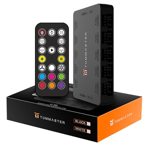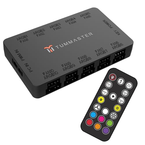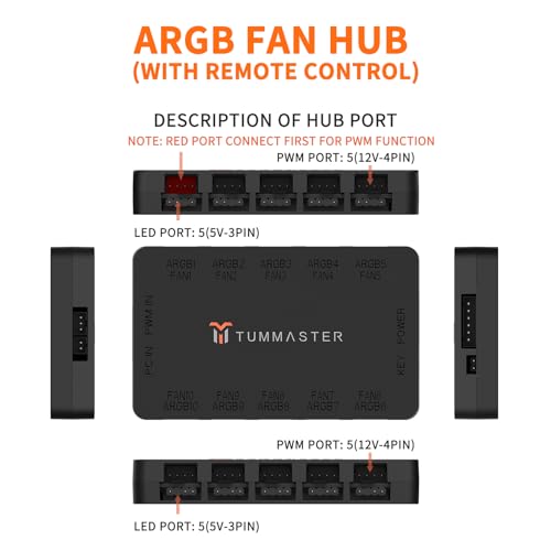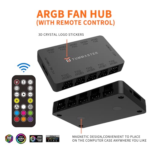 Specification: ARGB Fan HUB, 10-Port 4 Pin PC Fan Controller, 5V-3Pin ARGB Fan Hub, Magnetic Suction, SATA Power Input,RF Remote & Chassis Key Control,Controller Support 10 ARGB PWM Fans Splitter