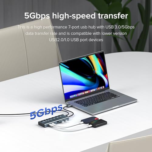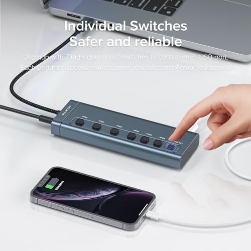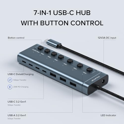 Powered USB Hub – 3 USB A 3.0 Data Ports and 4 USB C Data PD20W Output Fast Charging Individual buttom control with 36W power supply Suitable for Laptops,MacBook Pro,MacBook Air,iMac