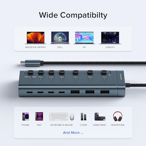 Specification: Powered USB Hub – 3 USB A 3.0 Data Ports and 4 USB C Data PD20W Output Fast Charging Individual buttom control with 36W power supply Suitable for Laptops,MacBook Pro,MacBook Air,iMac