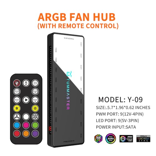 Y-09,ARGB Fan HUB, 9-Port 4 Pin PC Fan Controller, 5V-3Pin ARGB Fan Hub, Magnetic Suction, SATA Power Input,RF Remote ,Controller Support 9 ARGB PWM Fans Splitter,LED Light