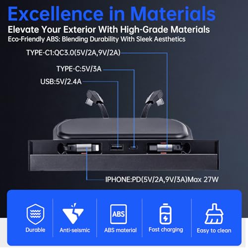 【Retractable Charging Cables】The charging cable is retractable, once you are done charging pull the cable back and it will retract back. It keeps everything clean and solves the problem of wires getting twisted. it is a great addition to your car.