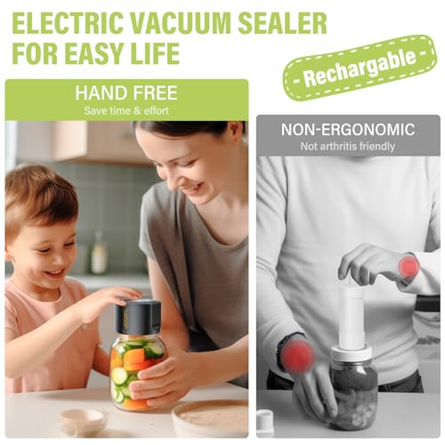 【About Vacuum Sealer for Mason Jar】Our rechargable mason jar vacuum sealer kit can lend a hand us to take away the air of the bottle so as to add the food storage time effectively, ideal gifts choices for housewifies on holiday, Christmas, Thanksgiving day, and so on.