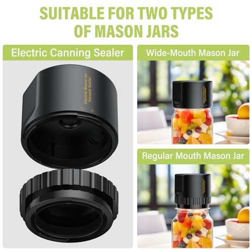 【Vacuum Sealer Machine for Jars Easy to Use】Suitable for 2 different mouth size jar, 2.75” regular-mouth mason jar and 3.5” wide-mouth mason jar. We just put the lids on bottle mouth and press the jar into the vacuum sealer, then press the buttom and wait