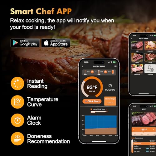 Specification: Wireless Meat Thermometer, Smart APP with Digital Instant Read, Alarm, Long Bluetooth Range, High-Temp-Resist Food Thermometer for Grilling and Smoking, Cooking, Oven, Rotisserie