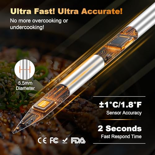 🥩🍷【Elevate Your Cooking Game】Cook with Confidence and Care! The 5.5 mm probe is designed to minimize damage to the meat’s texture. Perfect for all cookings—wireless meat thermometer for grilling and smoking, rotisserie, ovens, air fryers, skillets, and sous vide. With IPX7 waterproof and easy foam cleaning, it’s effortless to care for!