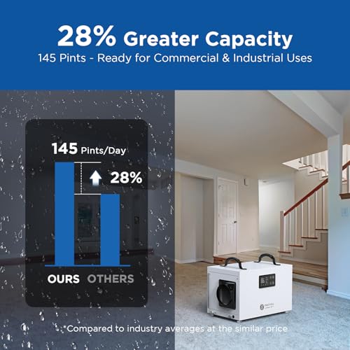Energy Star-rated dehumidifier: The 145 pints dehumidifier is Energy Star-certified, ensuring reduced energy consumption, cost savings, and environmental sustainability without compromising performance.
