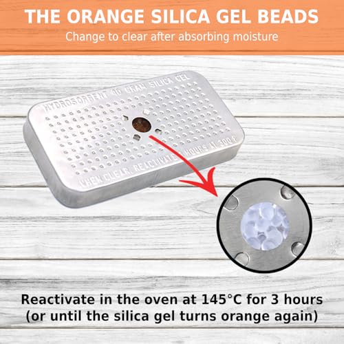 Rechargeable Design: This compact dehumidifier uses silica gel absorbent beads that change color from orange to clear when full of moisture. Once full, put our rechargeable dehumidifier silica gels tin canister in the oven at 280 – 300°F for 2 to 3 hours. Note: PLEASE preheat the oven before putting the beads in the oven.