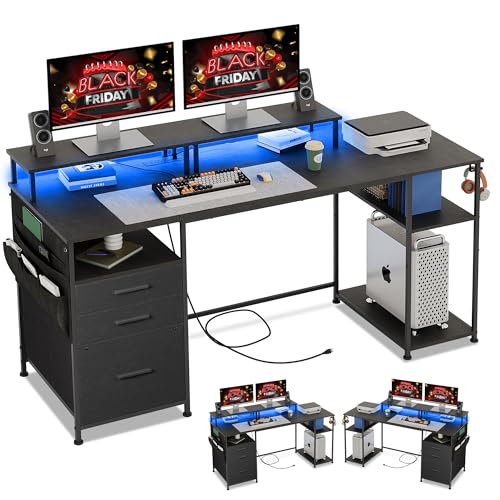 Specification: Computer Desk with 3 File Cabinet Drawers, 57.8” Reversible Gaming Desk with LED Lights and Power Outlets, Office Desk with Storage Shelves and Dual Monitor Stand for Home & Office (Black)