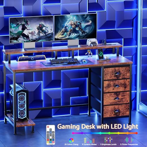 Furologee Computer Desk with 4 Fabric Drawers, 47″ Gaming Desk with Power Outlets and LED Lights, Home Office Desk with Full Monitor Stand and Shelf, Study Writing Desk for Bedroom, Rustic Brown