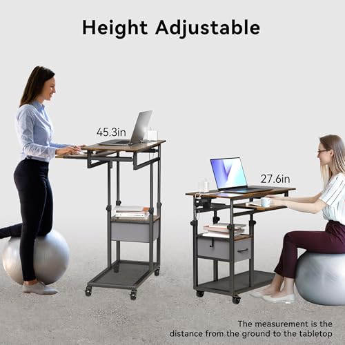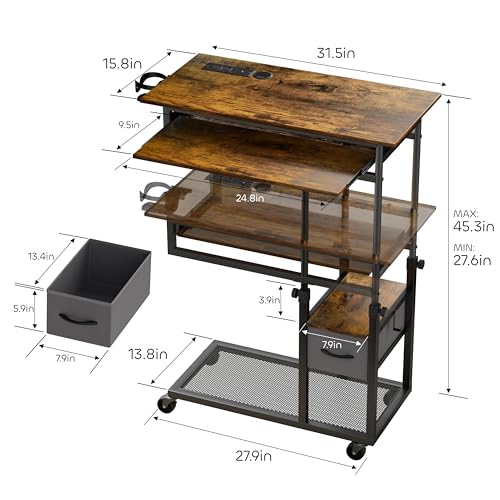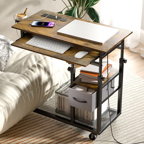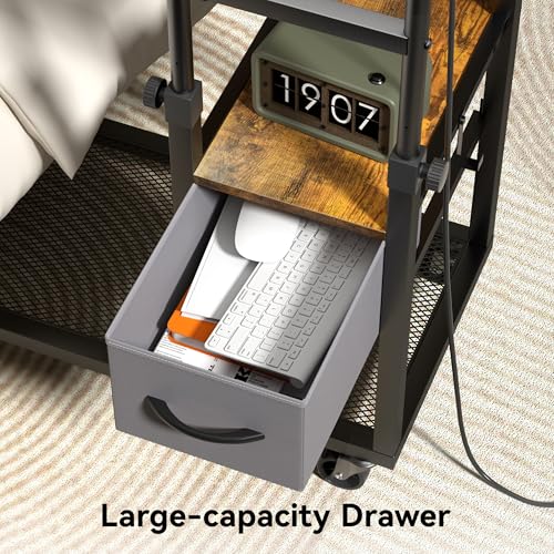 Height Adjustable C Table with Charging Station, Mobile Laptop C Shaped End Table, Couch Desk with Wheels, Couch Side Table with Storage Drawer for Living Room Bedroom