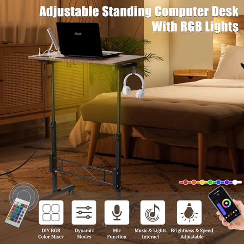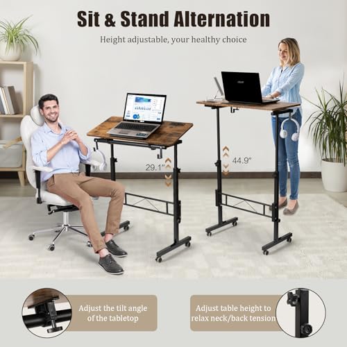 SIDUCAL Standing Desk Height Adjustable with Tiltable Tabletop, Rolling Laptop Desk with Charging Station, Sit Stand Portable Stand Up Desk with Wheels, Rustic Brown