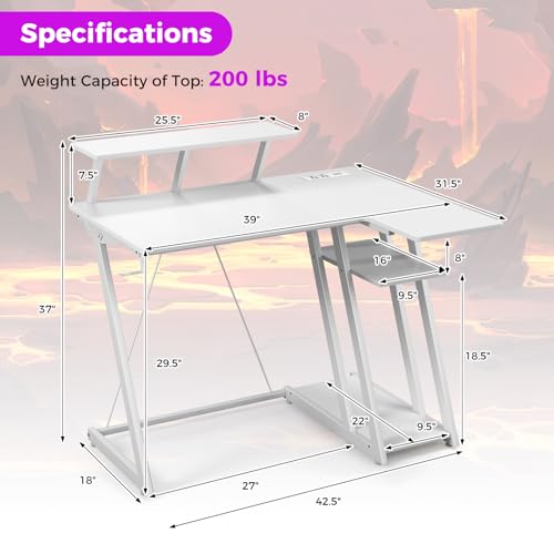 Specification: Tangkula L Shaped Gaming Desk with Power Outlets, Small Gaming Computer Desk 39inch with Storage Shelf, Corner Desk with Carbon Fiber Texture, Gamer Desk Gaming Table (White)