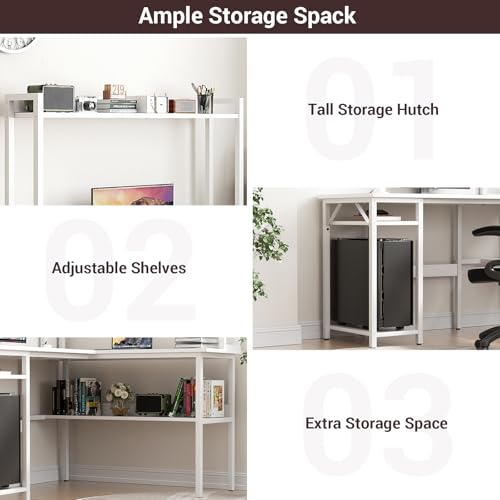 Specification: Unikito L Shaped Gaming Desk with LED Strip and Power Outlets, Reversible L-Shaped Computer Desk with Storage Shelves, Corner Desk with Hutch, 2 Person Home Office Desk, White