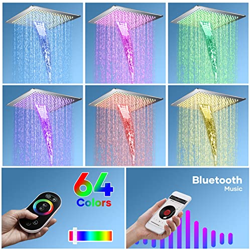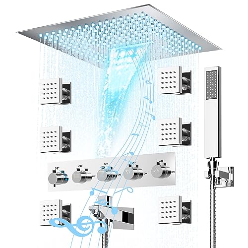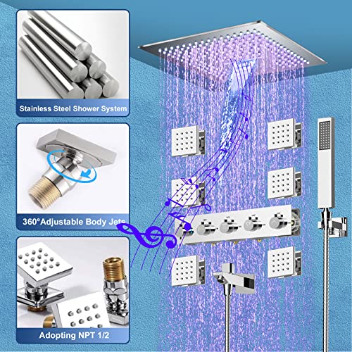 Specification: Thermostatic Shower Body jets System In Wall, 16 Inch LED Rainfall Shower Full Body Shower System with Rain Shower and Handheld Spray, Music Bluetooth Smart Control