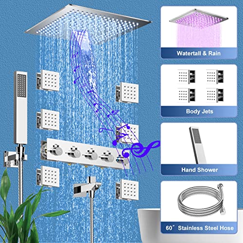 Thermostatic Shower Body jets System In Wall, 16 Inch LED Rainfall Shower Full Body Shower System with Rain Shower and Handheld Spray, Music Bluetooth Smart Control