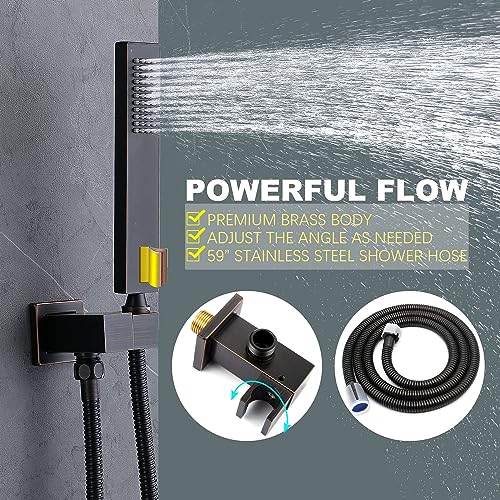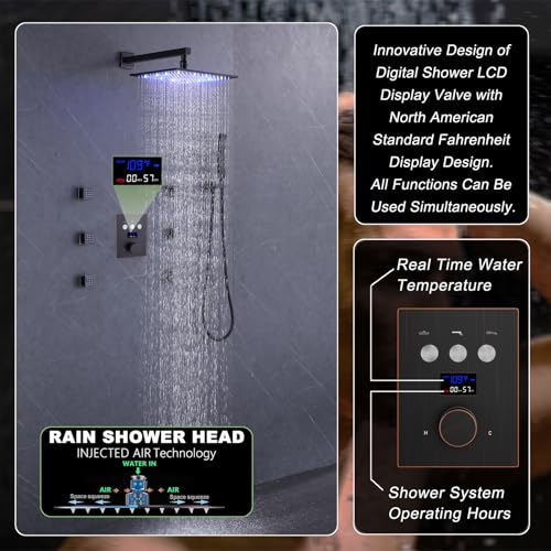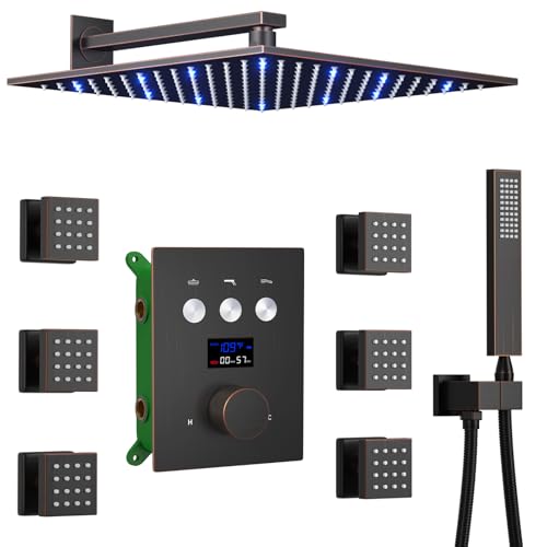 Specification: Thermostatic Shower System Oil Rubbed Bronze Shower Head System with 3 Way Digital Display Shower Faucet and 12 Inch Wall Mounted LED Luxury Rain Shower Head & 6 PCS Body Jets, Handheld Shower