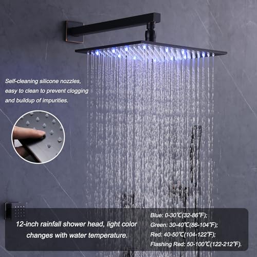 Thermostatic Shower System Oil Rubbed Bronze Shower Head System with 3 Way Digital Display Shower Faucet and 12 Inch Wall Mounted LED Luxury Rain Shower Head & 6 PCS Body Jets, Handheld Shower