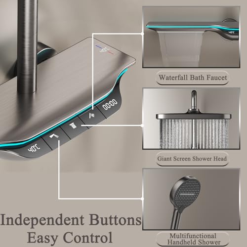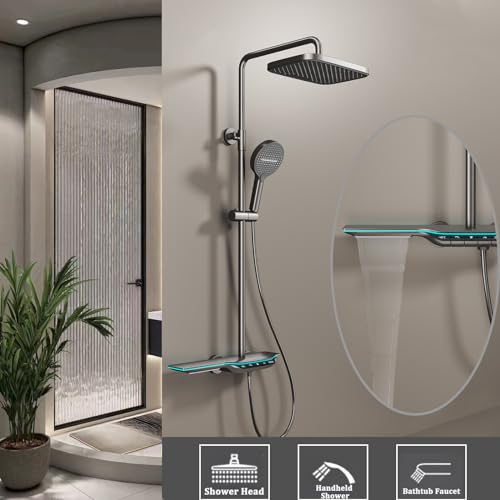 Specification: Thermostatic Shower System, Shower Faucet Set with LED Display Wall-mounted Shower Head Set Adjustable Height and Angle 3 Functions Shower Faucets with Waterfall Bathtub Faucet (Gun Gray A)