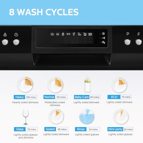 【8 Washing Cycles】- A number of the cleaning cycles, including Heavy, Normal, Baby-Care, ECO, Glass, and Speed, helped with extra-drying function, and deliver sparklingly cleaned and dried dishes. Three more cleaning options, including Speed, Mini-party, and Rinse, are designed for compact dishwasher, providing high flexibility for you to select in different situations.