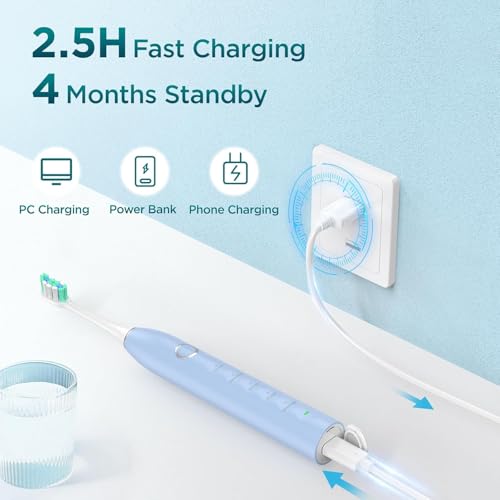 Specification: Electric Toothbrush for Adults with 8 Brush Heads, Sonic Toothbrush Rechargeable with a Holder & Travel Case, 2.5 Hours Charge for 120 Days Use – Light Blue