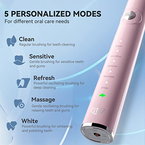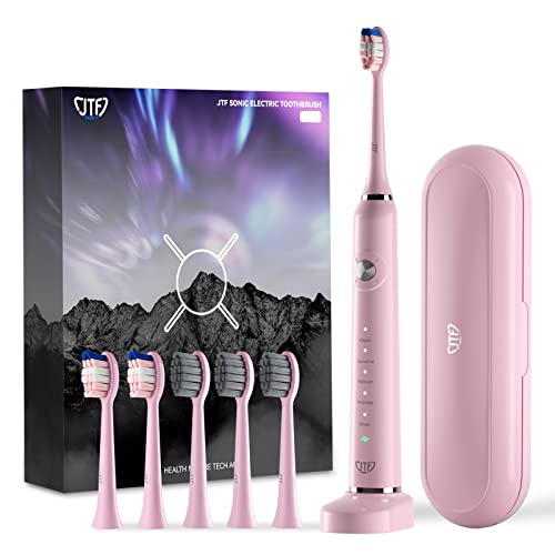 JTF Sonic Electric Toothbrush – with Travel Case and 6 Brush Heads, Fast Charging toothbrushes for 60 Days Long Lasting, 5 Modes Power Toothbrush for Women, Pink