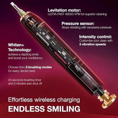 ELEGANCE INTELEGENCE & PERFORMANCE: The Whiten+ Edition toothbrush is a world-class electric toothbrush featuring cutting-edge technology. It boasts a powerful motor with 48,000 VPM, a lithium-ion battery, ultra-fast wireless charging, 5 operation modes, and smart vibration timers. It also includes a pressure sensor and intensity control for personalized cleaning. The set includes 8 DuPont engineered brush heads and a custom travel case, all in a sleek, lightweight, and IPX7 rated waterproof.