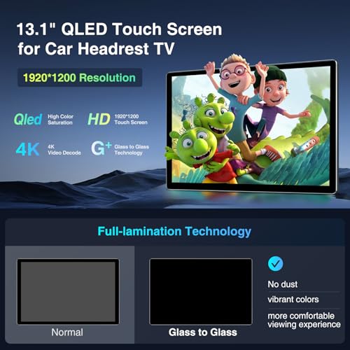 【13.1” HD QLED Touch Screen】The car headrest TV adopts 13.1-inch QLED screen with 1920*1200 resolution and supports 4K 3840’2160@60fps /H.265 video decoding.The screen is fully laminated, with no dust or air between the touch panel and the screen. Bright and delicate colors, clear details, give you an excellent visual feast.