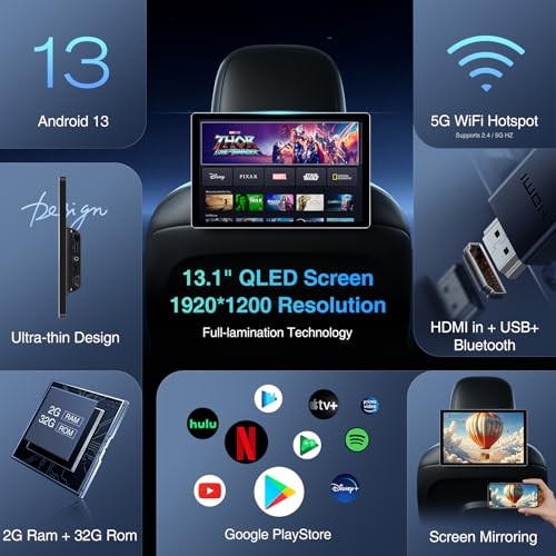 Specification: 13.1-inch 2G RAM + 32G ROM Android 13 Multi-Functional Car TV Headrest Monitor for Back seat, Full High Definition QLED Touch Screen Video Player, Support WiFi/Bluetooth/Mobile Mirror Link/HDMI/RCA