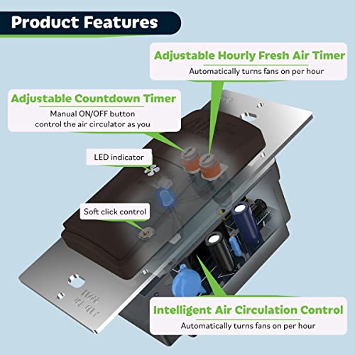 The TOPGREENER TDTS5-BR is a timer switch for your air-circulating fan. This countdown timer can replace most in-wall switches or receptacles to automatically operate your fresh-air fan periodically and circulate the air indoors. The fan timer features a manual ON/OFF switch that permits you to regulate the fan at your leisure, but if left unattended the automated controls will start up to operate the fan for a set time each hour. This improves the air quality by ensuring that the air indoors never remains stagnant for long. This air circulator fan timer is ideal for keeping indoor air fresh in both high humidity regions and colder regions where doors and windows may be closed for nearly 24 hours every day. The timer switch also conserves energy by ensuring that your fresh air fan is never left on by mistake. Settings can be easily adjusted by removing the face cover to reveal 2 small knobs, one for the ‘Timer’ and one for the ‘Mins per Hour’. The ‘Timer’ knob adjusts the amount of time that the fan will automatically turn OFF after being turned ON manually, at the same time as the ‘Mins per Hour’ knob adjusts the amount of time that the fan will automatically turn ON after each hour that it is OFF. The hourly settings can also be turned OFF completely if desired. These knobs allow for easy, customizable settings whether installed in the home, office, basement, or restroom. Note that the timer switch is designed specifically for air circulating fans such as exhaust or ceiling fans, so long as the fan’s motor is rated no higher than 1/4HP. This product requires a neutral wire for installation, and professional installation is recommended in consequence. Neutral wires are required by modern building codes and are regularly present in newer constructions that were built in the 80’s and 90’s. Older constructions in most cases do NOT have neutral wires. This product is UL listed.