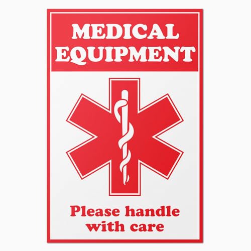 DESIGN | Features a vivid, eye-catching design with “Medical Equipment – Please Handle With Care” text in white & red on a contrast background for Immediate Attention