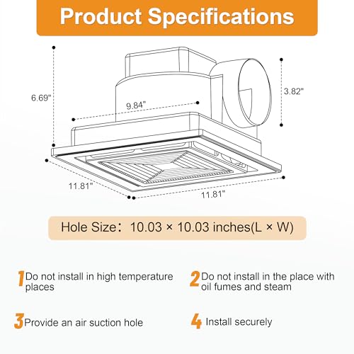Specification: Bathroom Exhaust Fan, 10 Inch Ceiling Mount Fan, 110 CFM 1.0 Sones Ultra-Quiet Ventilation Fan, Square Exhaust Fan Ceiling Mount