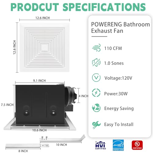 Specification: Bathroom Fan Ceiling Mount Exhaust Ventilation,110 CFM 1.0 Sones,4 Inches Duct,White,120V Quiet Ventilation and Exhaust Fan for Shower/Restroom/Office/Home