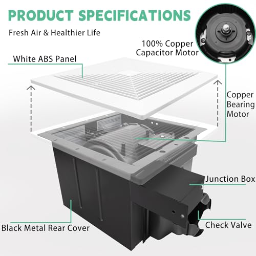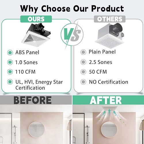 Excellent Performance:1.0Sones, 110CFM, efficiently and quickly eliminate moisture and odor without increasing energy consumption.