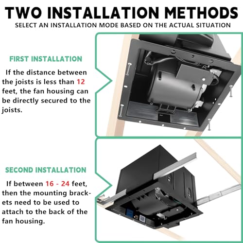 Easy Installation:The frame size of the exhaust fan is 10.6″ x 10.6″ and it comes with two mounting brackets. If the distance between the joists is less than 12 feet, the fan housing can be directly secured to the joists. If between 16 and 24 feet, then the mounting brackets need to be used to attach to the back of the fan housing.