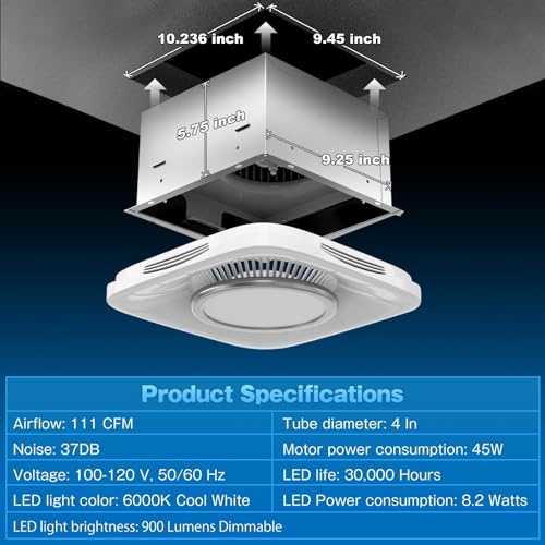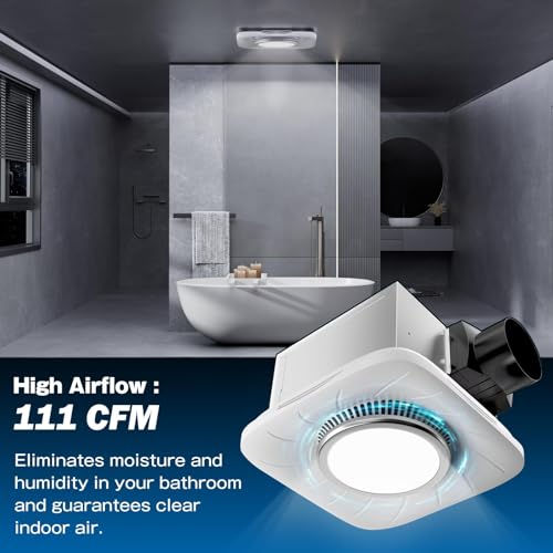 🛀Bathroom Fan with Light:111 CFM Exhaust fan with 1.5 sones for quiet operating performance. 900 LM bright 6000K LED light will light your entire bathroom