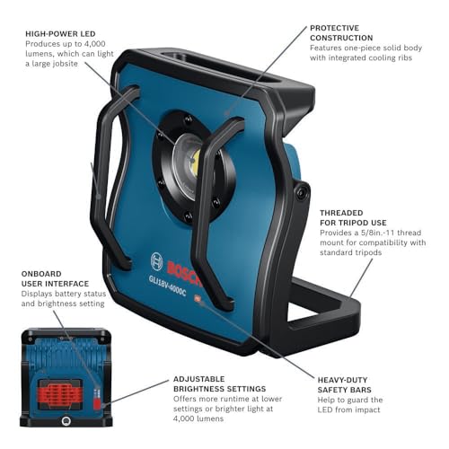 Specification: Bosch GLI18V-4000CN 18V Bluetooth LED Floodlight – 4,000 Lumens, Remote Control, Durable Metal Body, Adjustable Brightness & Long Runtime – Perfect for Job Sites & Outdoors (Bare Tool)