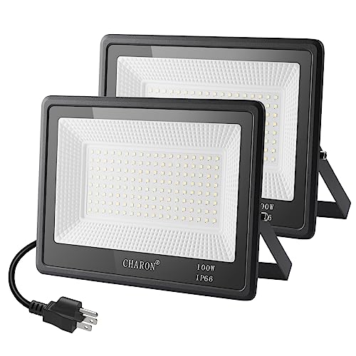 Specification: CHARON LED Flood Lights Outdoor, 100W Plug in Outside Work Light, 10000LM LED+Drive, 5000K Daylight, 85-265V, IP66 Waterproof Exterior Security Floodlights for Yard, Parking Lot, Playground (2 Pack)