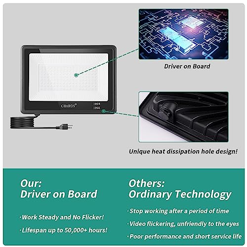 SUPER BRIGHT & NO FLICKER – Designed with Driver on Board technology, CHARON 100w led flood light out of doors can produce brightness as much as 10000 lumens without flickering. Environmentally friendly daylight white 5000k will make the scene more natural and authentic.