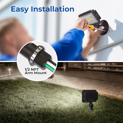 【2-Way Installation】Equipped with 180° adjustable 1/2″ NPT Arm Knucle, the LED wall pack light can be wall mounted and ground mounted, which can be widely used for garden, garage, landscape, court, lawn, patio, warehouse, workshop, barn, pathway, sign, flag, etc.