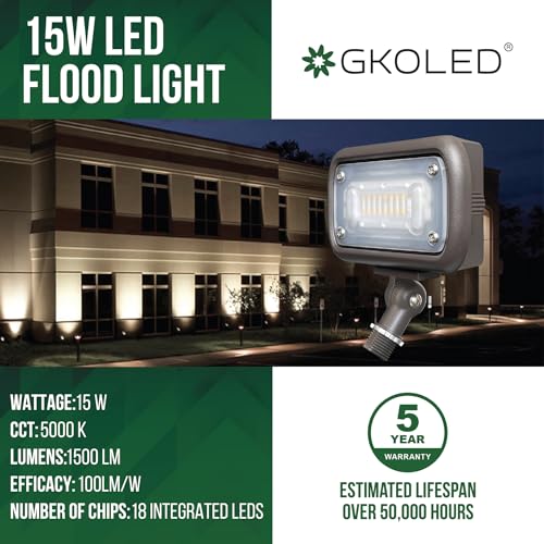 Specification: GKOLED 15W LED Floodlight, Outdoor Security Fixture, 1500 Lumens, 50W MH Equivalent, 5000K Daylight White, 120-277V, UL-Listed (2 Pack)