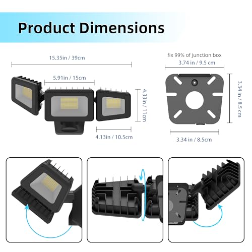 【Flexible 3 Heads Design】 Our exterior lighting fixtures are designed with three adjustable light heads that may be easily maneuvered to different angles, allowing you to customize the lighting to meet your specific needs. With a bright white light output of 6500K, these flood lights offer a wider lighting angle and larger coverage area in comparison to other similar products.