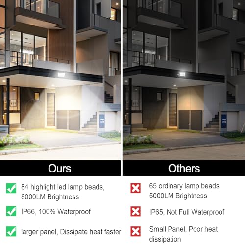Ultra Bright and Energy Saving: The 80W LED flood light comes with 84 ultra-bright LEDs which can produce up to 8000lm high brightness. Equivalent to 800W traditional inefficient and energy-intensive light bulbs, saving 90% on your electricity bills. 120°beam angle and shadow-free, which illuminates the corners more efficiently