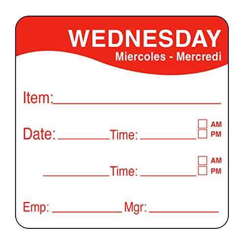 Labels are color coded with traditional food service colors for every day of the week in English, Spanish, and French