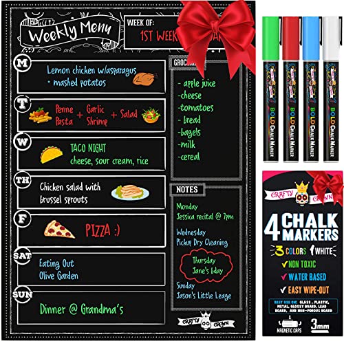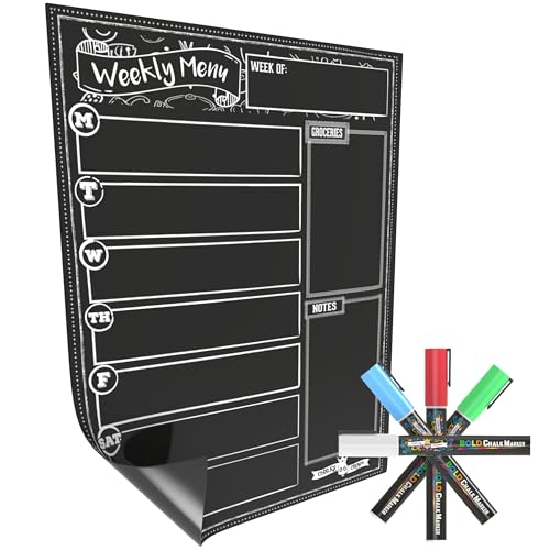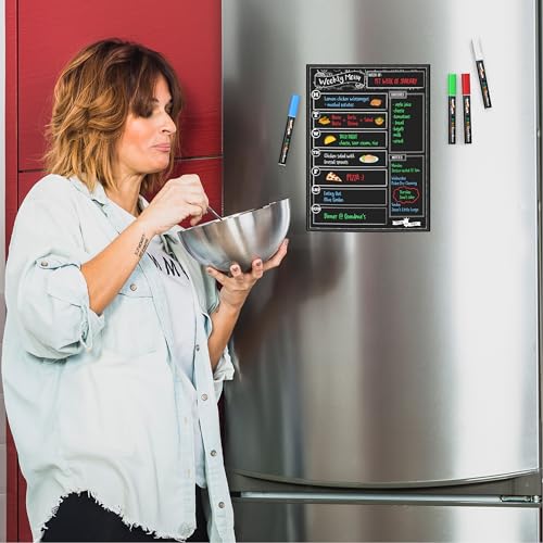 Magnetic Dry Erase Menu Board for Fridge Includes 4 Liquid Chalk Markers – Weekly Meal Planner Blackboard, Grocery List and Notepad for Kitchen Refrigerator – Chalkboard Magnet