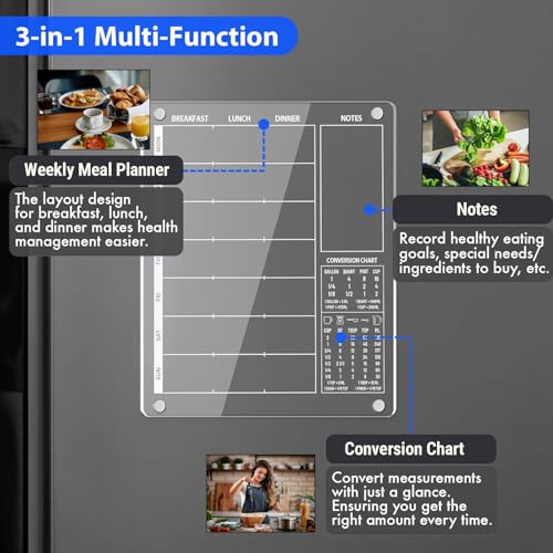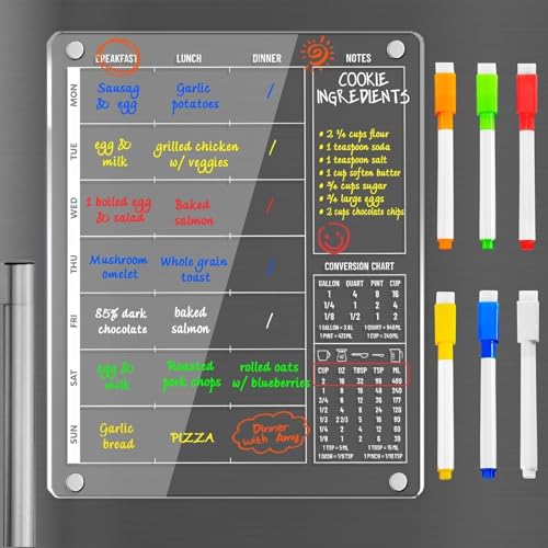 Specification: PigPotParty 3 in 1 Acrylic Magnetic Meal Planner for Fridge with Conversion Chart, Menu Board for Kitchen w/ 6 Markers, Dry Erase Meal Plan for Refrigerator, 9.5″x 12″