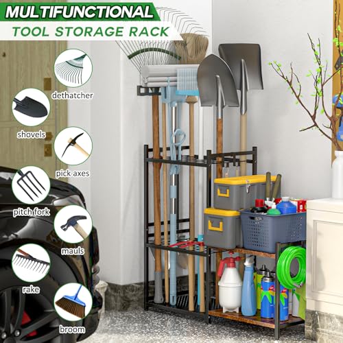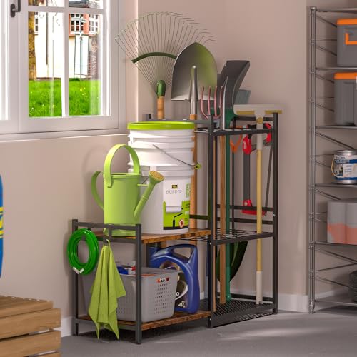 Specification: Garage Tool Organizer with 2-tier Wooden Shelves, Yard Tool Organizer for Garage with 6 Hooks, Heavy duty Steel Garden Tool Rack Holds up to 35 Long Handled Yard tools for Storage, Black