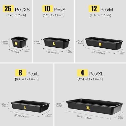 【Upgraded 5 Sizes】- These tool box organizer tray contains 4 pcs XL size (12.4×6.1×1.7 inch), 8 pcs L size ( 9.3×6.1×1.7 inch), 12pcs M size ( 9.1x3x1.7 inch),10 pcs S size (6.2x3x1.7 inch) and 26 pcs XS size (3x3x1.7 inch).