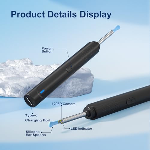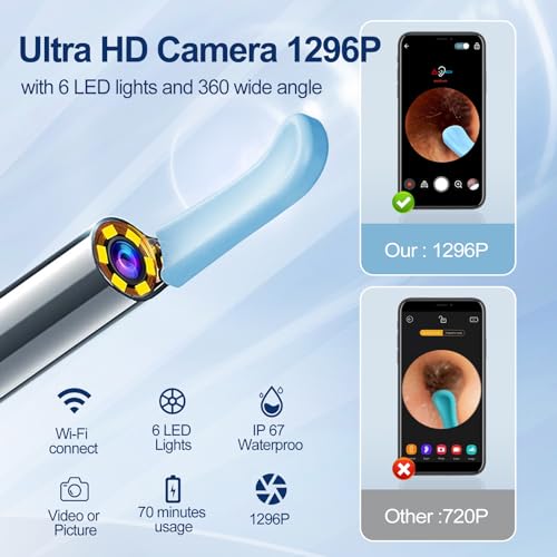 [1296P HD Camera]:ear wax removal tool camera is equipped with 360°wide-angle professional grade lens which provides a large coverage view. 6 LED lights will greatly support the brightness and sharpness of the image in ear canal and get rid of earwax more completely and safely. With upgraded 1296P full HD resolution can capture more realistic images or record stunning videos.